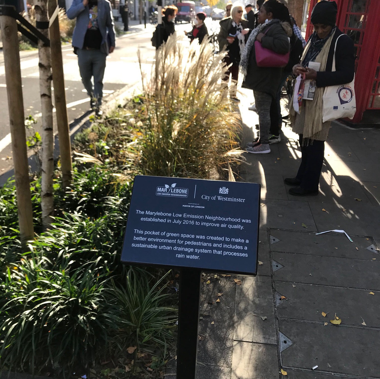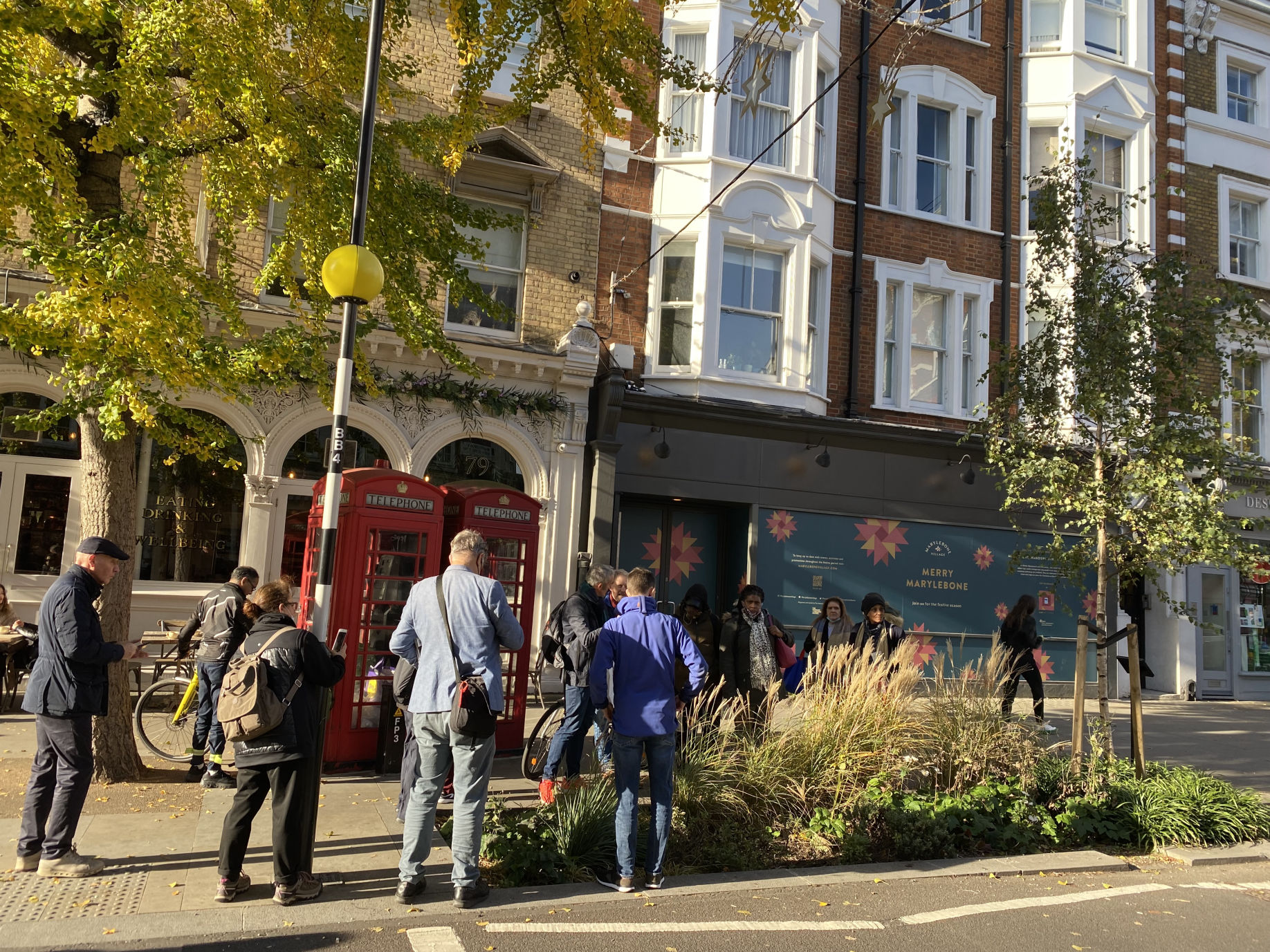 Marylebone High Street: SuDS planting beds integrated into the streetscene with active shop frontages.